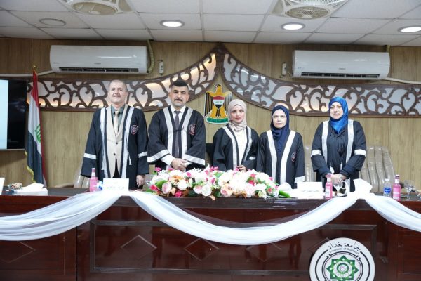 : ناقشت كلية العلوم للبنات في جامعة بغداد رسالة الماجستير(: تحضير وتشخيص ودراسة الفعالية الحيوية لمعقدات جديدة من أيونات الفلزات مع مركبات مشتقه من الهيدرازين )